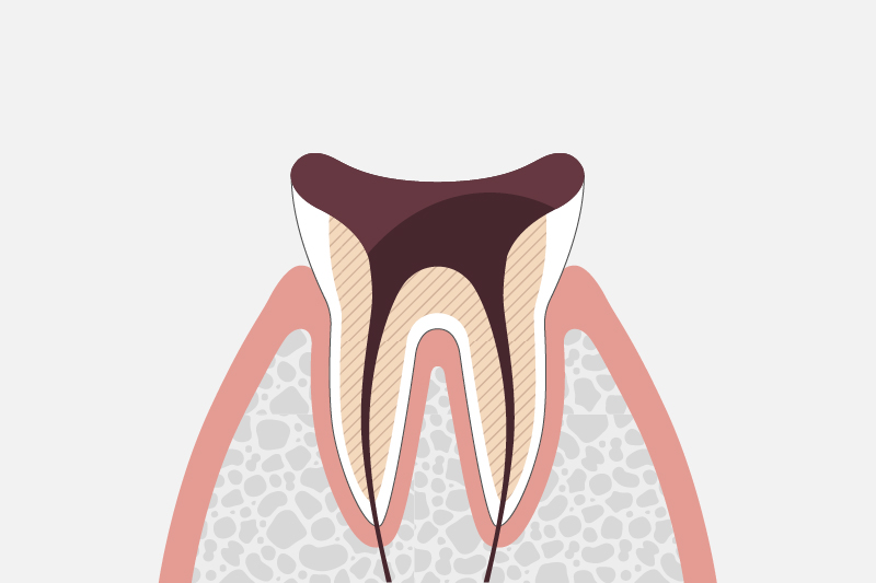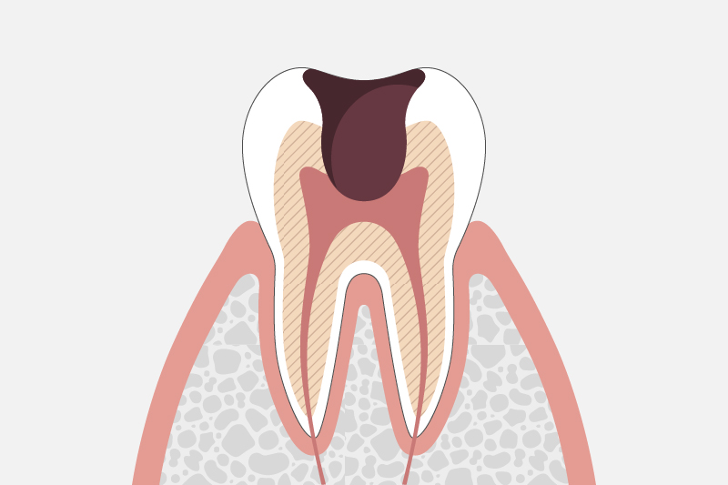 細菌感染が象牙質の内側の歯髄(歯の内部の神経)にまで達した状態の虫歯です。歯髄に細菌が進入し、ズキズキと激痛を伴う場合があります。